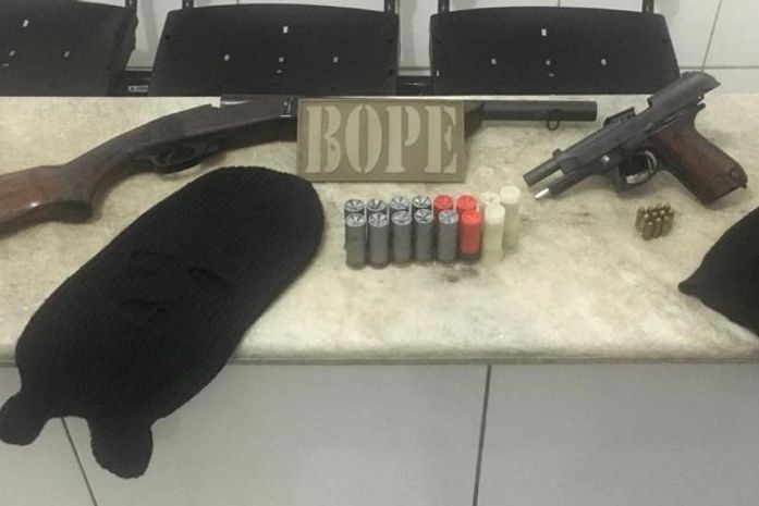 Os militares realizaram buscas no local e encontraram uma pistola PT 57 7,65mm com onze munições, uma espingarda calibre 12 com 15 munições e duas balaclavas.