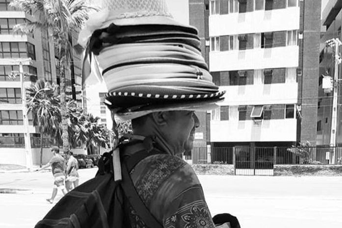 Na caminhada diária vejo um homem, na areia da praia de Jatiúca,e obsevo sua destreza ao equilíbriar,com o corpo, uma montanha de chapéus.