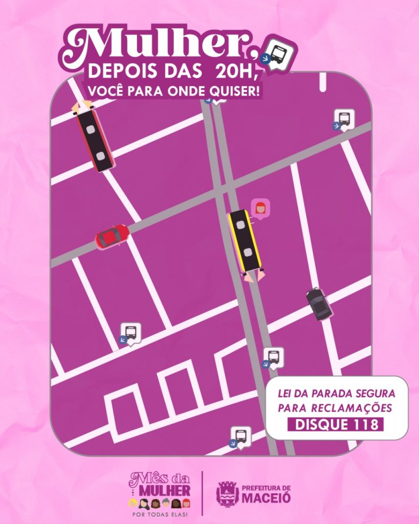 A Lei da Parada Segura garante que as passageiras que utilizam diariamente os coletivos do Sistema Integrado de Mobilidade de Maceió (SIMM) solicitem o desembarque fora dos pontos de paradas de ônibus, a partir das 20h. A medida é regulamentada pela Superintendência Municipal de Transportes e Trânsito (SMTT) e leva em consideração que determinadas áreas podem oferecer maior risco à integridade feminina, tornando esse público mais vulnerável.