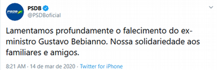 Em sua página no Twitter, o PSDB lamentou a morte de Bebianno.