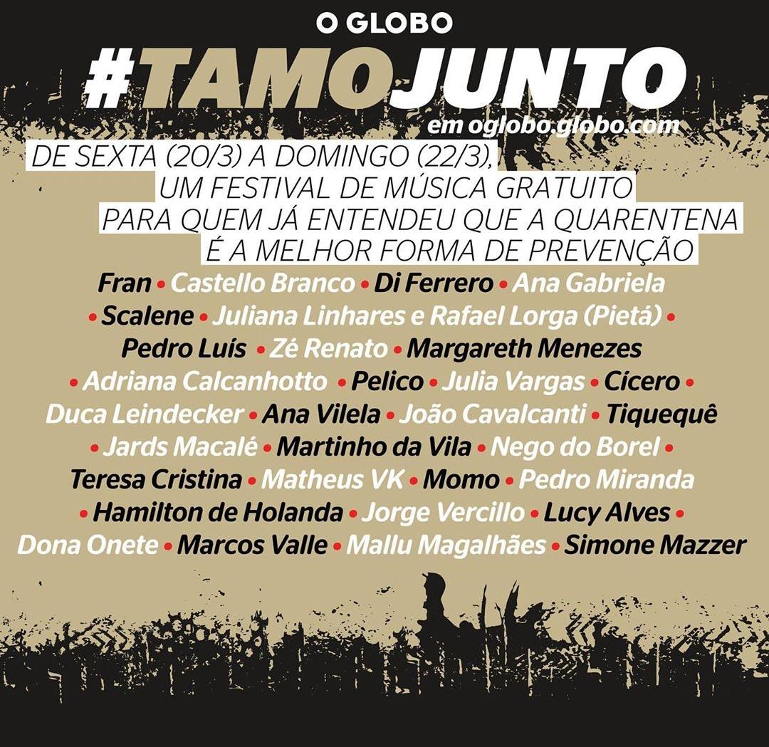 Para deixar esse momento mais leve, vamos trazer novos parceiros que você possa aproveitar em casa, dicas de como aproveitar esse período preservando sua saúde e muito conteúdo especial. O 1ª deles é o festival de música online #tamojunto que reúne grandes artistas para um concerto online com transmissão ao vivo nas redes sociais do Globo.