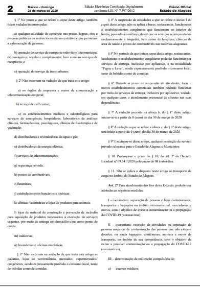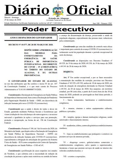Em uma publicação extra do Diário Oficial do Estado publicada neste domingo (29), o governador Renan Filho manteve sem funcionamento museus, cinemas e outros equipamentos culturais, públicos e privados; templos, igrejas e demais instituições religiosas, sendo autorizado o funcionamento interno; academias, clubes, centros de ginástica e estabelecimentos similares; lojas ou estabelecimentos que pratiquem o comércio ou prestem serviços de natureza privada; shoppings centers, galerias/centros comerciais e estabelecimentos congêneres, salvo quanto a supermercados, farmácias e locais que prestem serviços de saúde no interior dos referidos estabelecimentos; e eventos e exposições.