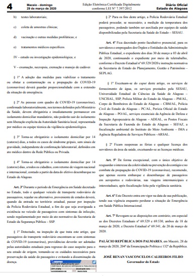 “Durante o período de Emergência em Saúde decretado no Estado, todo e qualquer veículo de transporte rodoviário de passageiros, regular ou alternativo, proveniente de estados deverá, quando da entrada no território estadual, passar por inspeção da Polícia Rodoviária Estadual, a fim de que seja averiguada a existência no veículo de passageiros com sintomas da infecção, sendo regulamentado por meio de ato normativo da Secretaria de Estado da Segurança Pública”, frisa um trecho do decreto.