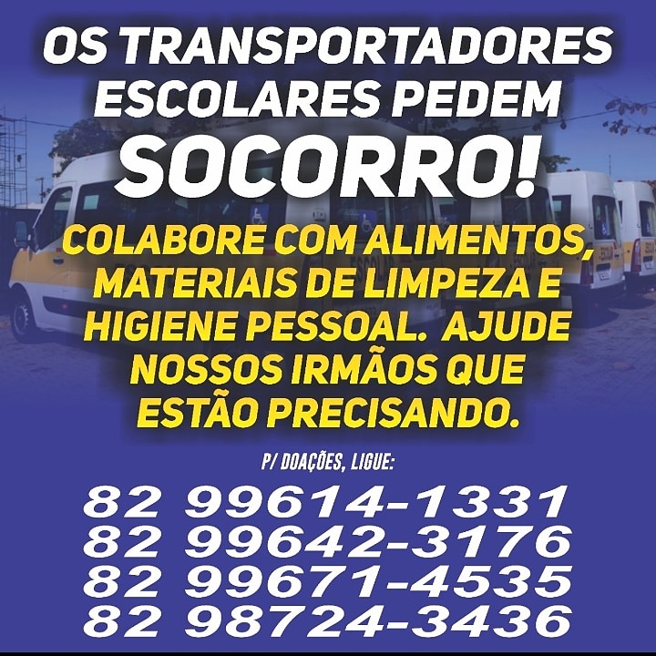 Buscando ajudar uns aos outros, a categoria lançou uma campanha nas redes sociais, onde afirmam que ‘Os transportadores escolares pedem socorro!’ e frisam que quem puder contribuir com estes profissionais façam doações de alimentos, materiais de limpeza e até mesmo de higiene pessoal.