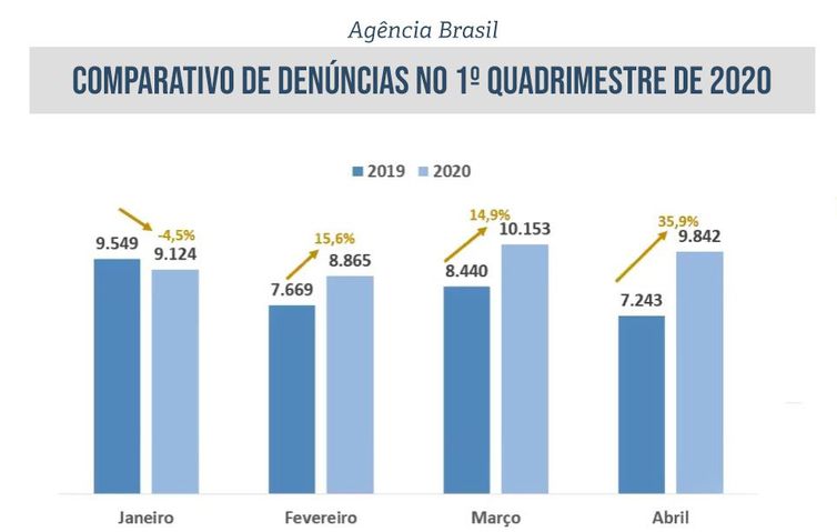 Segundo a ouvidoria, na comparação com janeiro de 2019, o número de denúncias registradas por meio do Ligue 180 diminuíram 4,5% em janeiro deste ano. Já em fevereiro, houve um aumento de 15,6% das notificações quando comparado ao mesmo mês do ano passado. A tendência se manteve em março, quando o novo coronavírus chegou ao país e algumas unidades da federação começaram a adotar medidas para isolar a população e, assim, tentar conter a disseminação da doença.