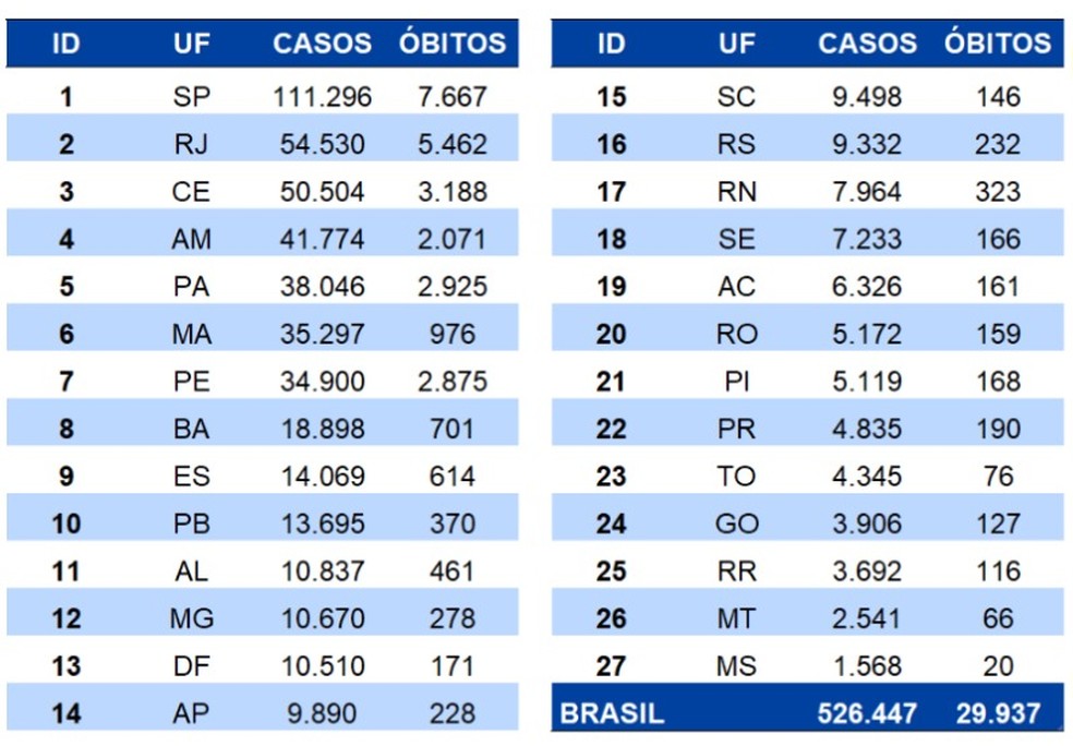 Além disso, o ministério ainda investiga 4.412 casos suspeitos. Veja abaixo a distribuição dos casos e mortes por estado: