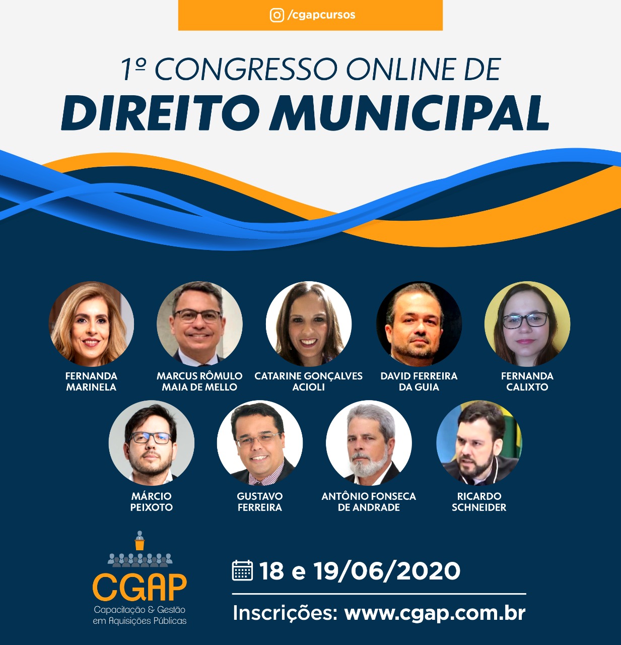 Nos próximos dias 18 e 19 de junho a professora Fernanda Karoline Oliveira Calixto, servidora pública, mestra e doutoranda em direito público participará do 1º Congresso Online de Direito Municipal, organizado pela CGAP, para falar sobre Auditoria de vícios nas contratações públicas e insights para que se evite erros grosseiros nas contratações decorrentes do enfrentamento à COVID-19.