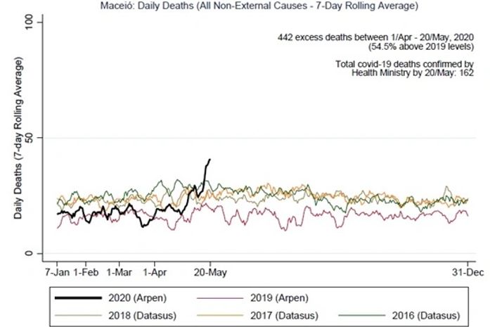 A figura acima é do estudo de FUJIWARA, Thomas. Estimating Excess Deaths due to Covid-19 in Brazil using the Cartórios Data. Princeton, EUA, 04.06.2020. Disponível em http://www.princeton.edu/~fujiwara/papers/excess_deaths.pdf