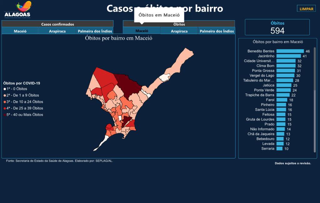 Já no que se refere ao número de óbitos, ranking é predominante dominado por bairros da periferia maceioense. Benedito Bentes lidera com 46 registros, o Jacintinho ocupa a segunda colocação com 41, seguido da Cidade Universitária com 32, Ponta Grossa, com 31 casos e Vergel do Lago com 30 mortes pelo novo coronavírus.
