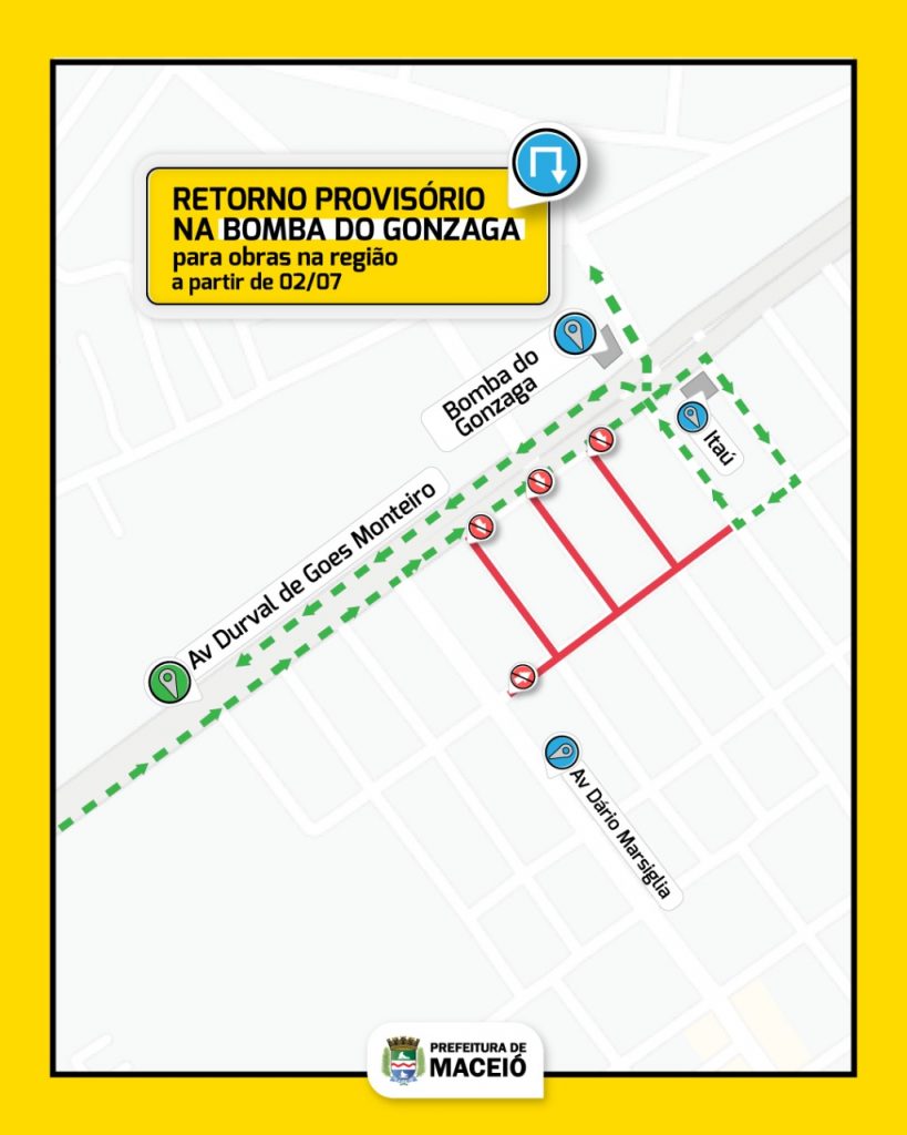 Com os bloqueios, os condutores que quiserem acessar a Bomba do Gonzaga deverão seguir pela Avenida Durval de Góes Monteiro, entrar à direita na Avenida José Bandeira Bastos (na rua do Banco Itaú do Tabuleiro), em seguida virar à direita na Rua João Lins Calheiros e, por fim, entrar à direita novamente na Rua José Vieira para realizar o contorno. A partir deste trecho, o cidadão poderá acessar a Bomba do Gonzaga ou virar à esquerda e seguir pelo sentido Tabuleiro/ Centro da Avenida Durval de Góes Monteiro.