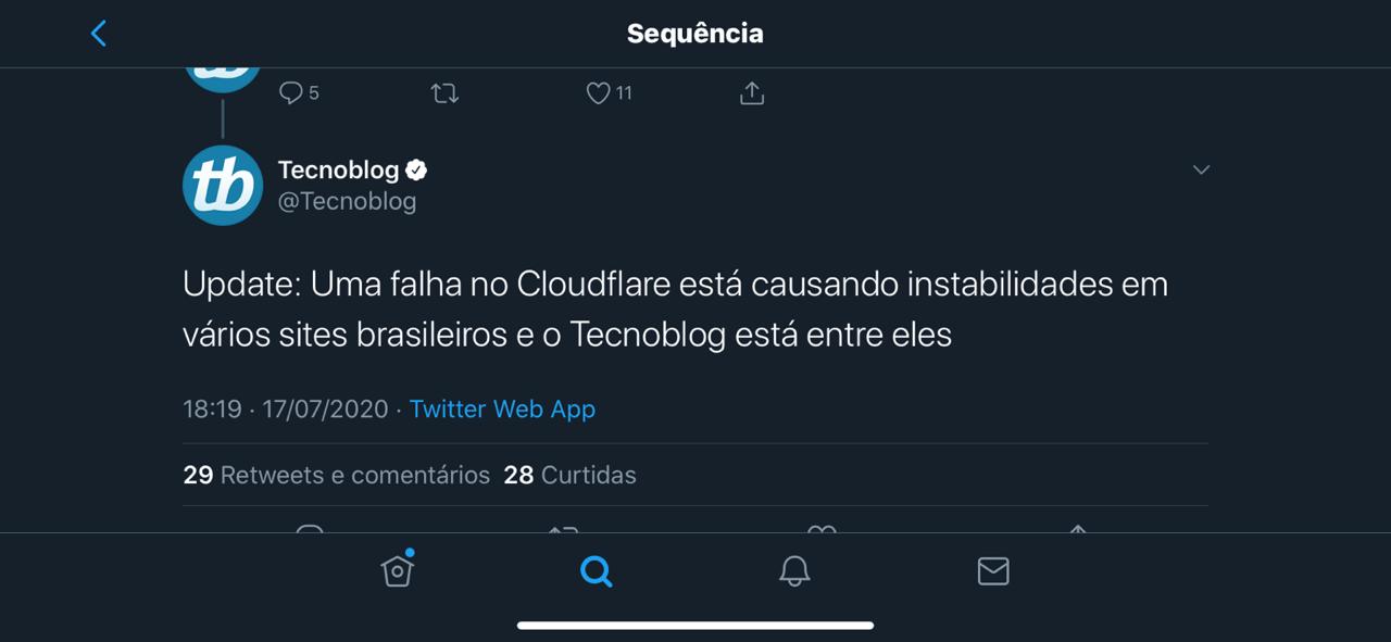 Nesta sexta-feira, também por meio do Twitter, a companhia explicou que está passando por instabilidades e que elas podem afetar diversos sites. O problema já foi identificado e a companhia está trabalhando em uma correção. "A Cloudflare está investigando questões com o Cloudflare Resolver e nossa rede distribuída em certas localidades. Clientes usando serviços Cloudflare em certas regiões são impactados, uma vez que requisições podem falhar e/ou erros podem ser exibidos", diz o status do sistema.