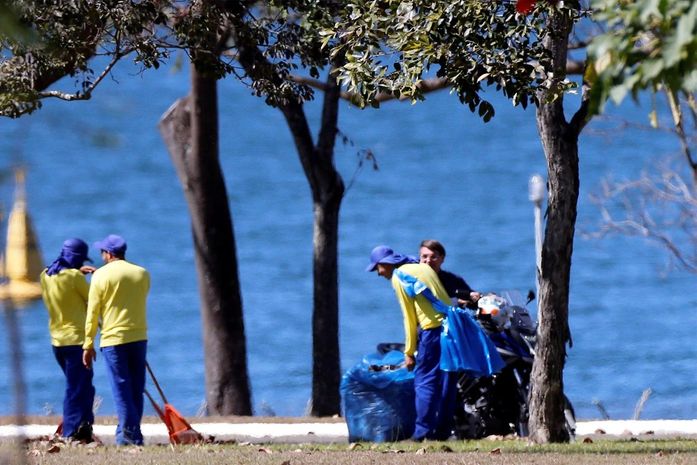 Infectado pelo coronavírus e cumprindo isolamento no Palácio da Alvorada, o presidente Jair Bolsonaro (sem partido) passeou de moto dentro da propriedade nesta quinta-feira (23) e, sem máscara, conversou com profissionais que fazem a limpeza na área externa da residência oficial.