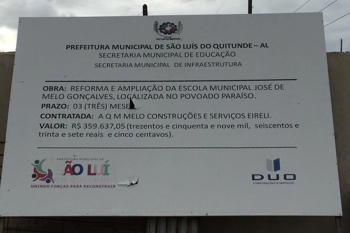 Orçada em quase R$ 360 mil e executada pela A Q Melo Construções e Serviços Eireli, em contratação por tomada de preço, a obra hoje se resume a uma placa no chão e um andaime mal montado (Ver vídeo). É o que condena a dona Maria Eduarda, moradora do povoado. "Se depender deste resto de metralha, acho que o Município vai colocar meu filho para estudar em casa”.