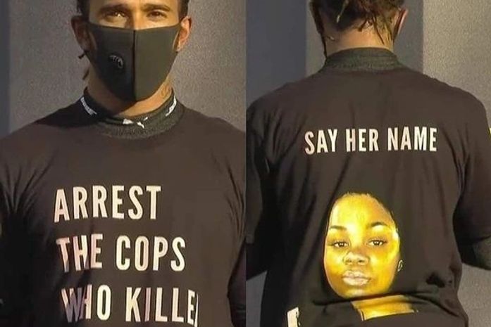 O piloto subiu para pegar seu troféu usando uma camiseta com os dizeres "Prendam os policiais que mataram Breonna Taylor". Nas costas, ele colocou uma imagem da jovem, com uma frase pedindo para falarem o nome dela.