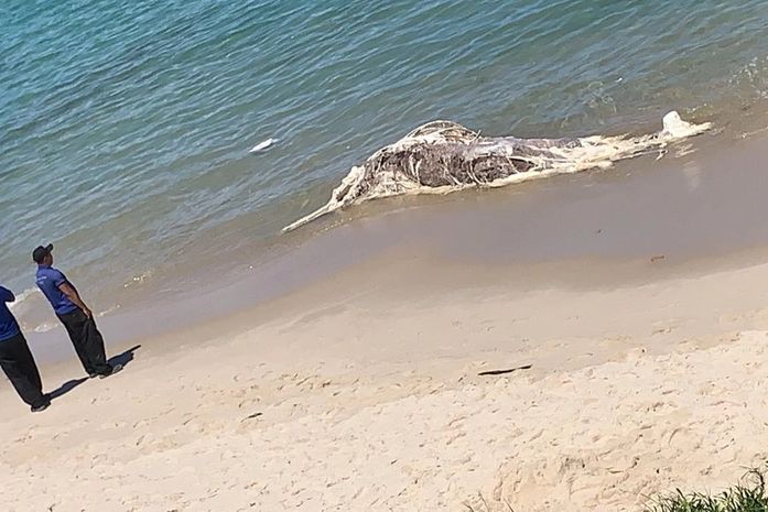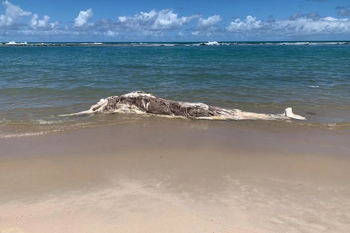 Uma baleia morta e já em avançado estado de decomposição foi encontrada encalhada na praia da Barra de São Miguel, litoral Sul de Alagoas, no final da manhã desta sexta-feira (25).
