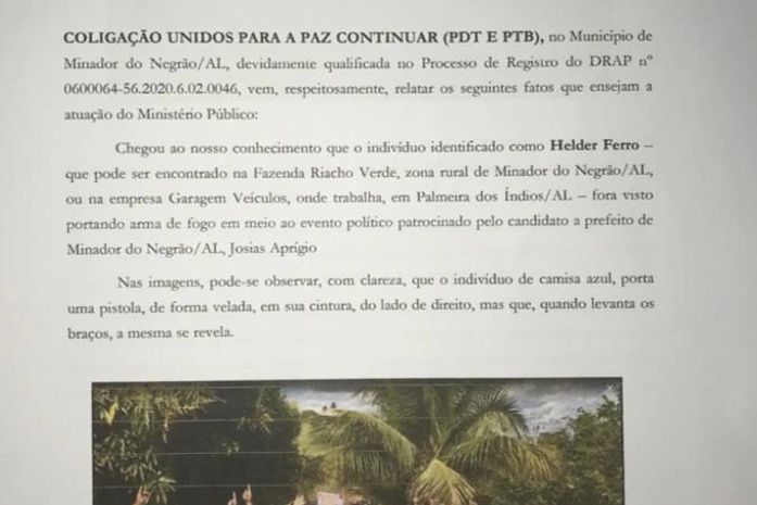 O candidato Emílio Barros defende a tese de que houve crime eleitoral de intimidação de eleitores, porque havia um cabo eleitoral armado na caminhada progressista. Com isso, Josias Aprígio deve ser alvo de investigação solicitada ao MP. Na denúncia, o candidato é acusado de “permitir que seus apoiadores desfilem com armas de fogo”