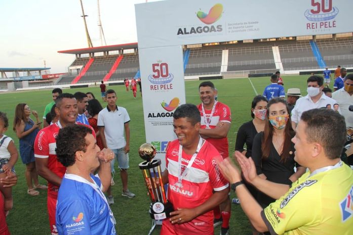 Finalizando a programação, o jogo entre os ex-jogadores de CSA e CRB. Clima festivo, mas de muita disputa. Em campo, empate em 1 a 1, com o time do CSA entregando de forma simbólica o Troféu 50 Anos do Rei Pelé para o time do CRB.