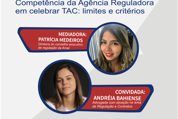 A Agência Reguladora de Serviços Públicos do Estado de Alagoas (Arsal) realiza nesta quinta-feira (19), das 10h às 11h, uma webinar com o tema:“Competência da Agência Reguladora em Celebrar Termos de Ajustamentos de Condutas: Limites e Critérios”.