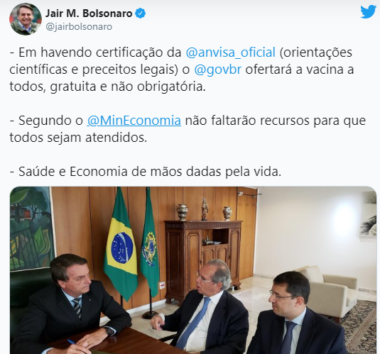 "Havendo certificação da Anvisa [Agência Nacional de Vigilância Sanitária] (orientações científicas e preceitos legais), o governo ofertará a vacina a todos, gratuita e não obrigatória", escreveu em sua conta no Twitter.