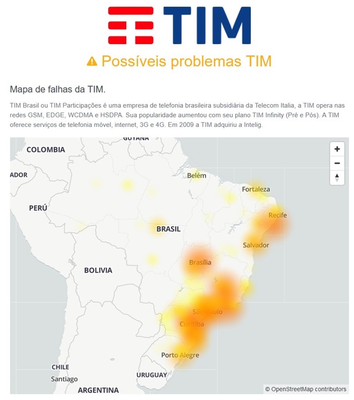 Clientes da operadora TIM estão sem sinal em várias partes do Brasil, segundo relatos de usuários reunidos pelo DownDetector. Há ainda reclamações em redes sociais como o Twitter.