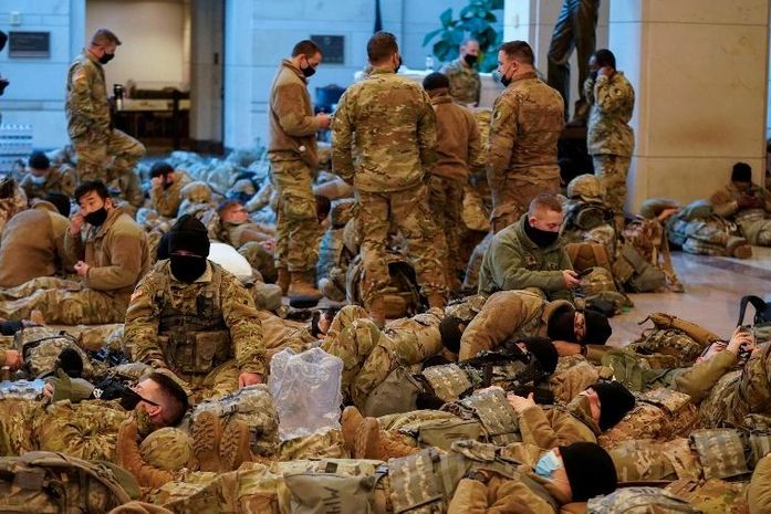 Membros da Guarda Nacional dos Estados Unidos foram fotografados descansando no chão do Capitólio hoje, dia em que a Câmara dos Deputados começou a debater o impeachment do presidente Donald Trump.