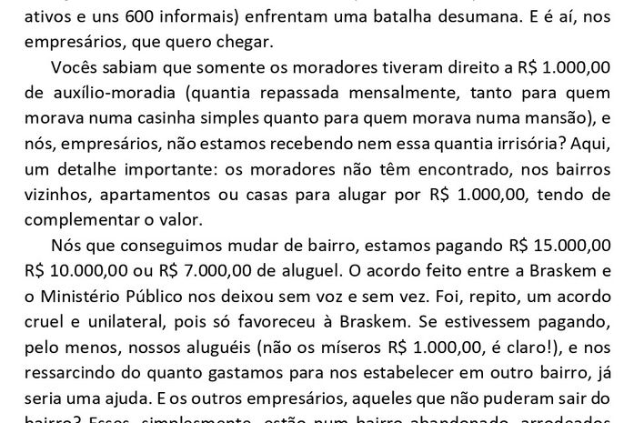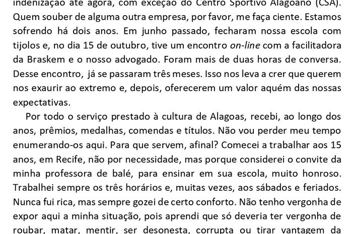 A professora Eliana Cavalcanti, bailarina e empresária, dedicou-se quase meio século à cultura de Maceió. Seu nome é referência na formação de alunos e profissionais da dança. Um breve resumo de sua vida e luta está circulando nas redes sociais. No relato, ela informa que, pela bagatela de R$ 10 mil, foi obrigada a assinar um termo no qual renuncia à posse de sua propriedade, sua tão conhecida academia de ballet, em razão de um acordo Braskem/Ministério Público, sem saber ao certo quando e se receberá alguma indenização.