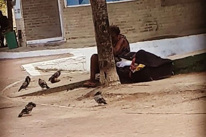 Quitéria, deitada no chão duro sob o sol a pino, trazia como companhia uma mala preta, grande, onde deve guardar seus tesouros de sobrevivência.