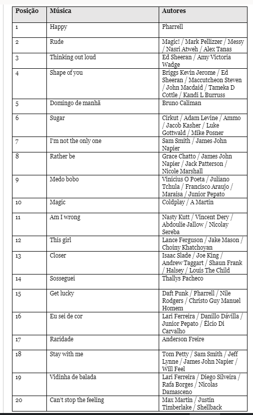 A partir deste ranking, foi possível identificar que, entre as 20 primeiras colocadas, seis são canções nacionais. As demais são internacionais, inclusive a que ficou na liderança: “Happy”, de autoria de Pharrell. Entre as cinco primeiras, aparecem “Rude”, “Thinking out loud”, “Shape of you” e “Domingo de manhã”.