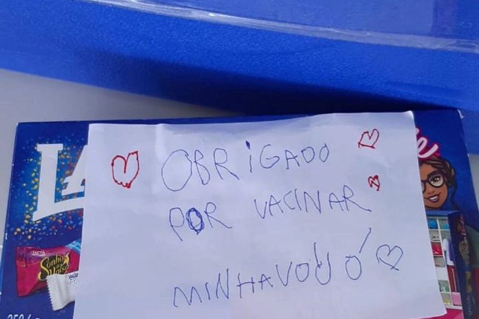 Uma criança levou uma caixa de chocolates, junto com uma cartinha escrita à mão, para entregar aos profissionais por vacinarem sua avó.