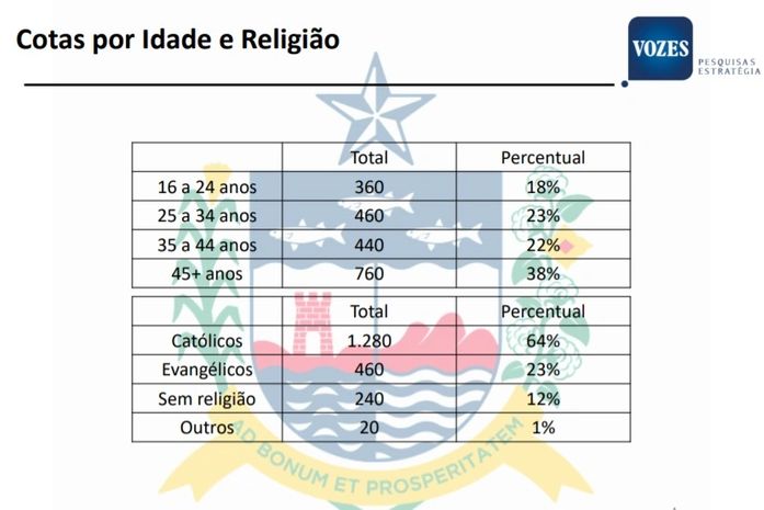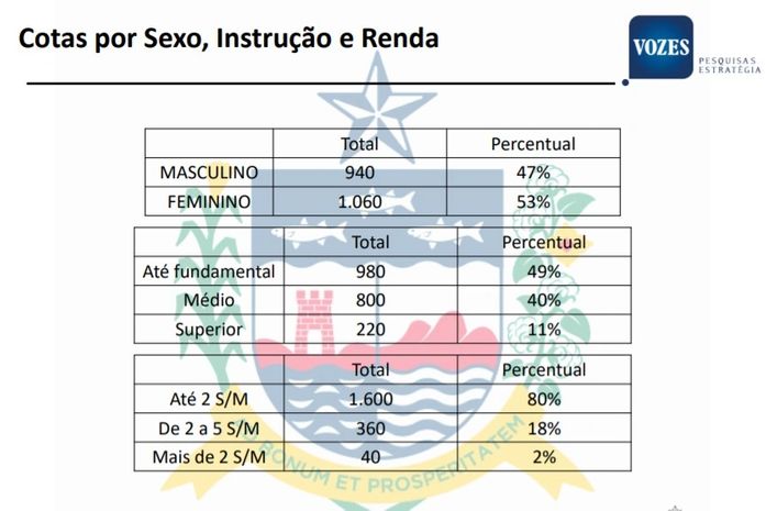 A Vozes Pesquisa e Estratégia entrevistou duas mil pessoas entre nos dias 9 a 18 de abril, em todas as oito regiões administrativas do Estado. A margem de erro, aponta o instituto, é de 2,19 pontos percentuais para o total da amostra. O intervalo de confiança é de 95%.