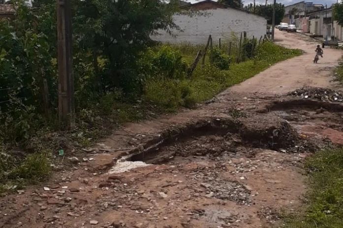 O barro cedeu e formou crateras imensas dificultando a passagem de pedestres e principalmente, veículos isolando parte da rua. Por pouco, as fissuras não atingiram um poste de energia elétrica. O problema é antigo e se repete sempre que chove forte. "O cano que colocaram aqui é pequeno e não suporta a força e o volume da água", relata morado