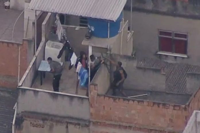 Às 7h30, criminosos com fuzis foram vistos pulando de laje em laje, em fuga (veja vídeo abaixo). Os homens passavam as armas de mão em mão pelos muros enquanto corriam pelos telhados das casas.