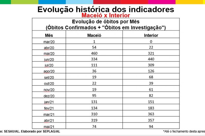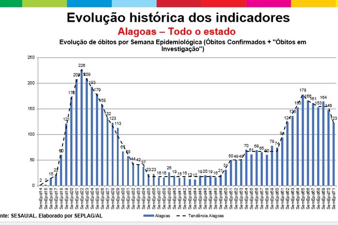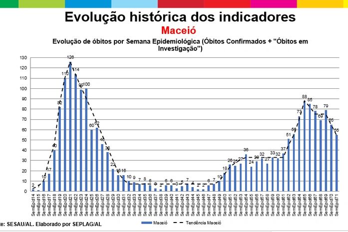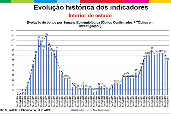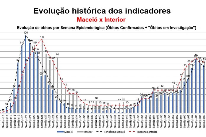 Na dimensão evolução de óbitos, Alagoas chegou a ter na segunda onda 178 mortes em uma semana e há uma tendência de queda, sendo registrado, no último sábado, 123 óbitos. Na capital foram 88 óbitos e chegamos a 55, média de 8 óbitos por dia. No interior foram 90 óbitos e na semana passada fechou em 68 óbitos.