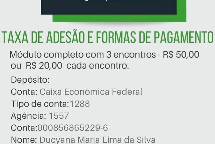 Valores: Módulos com três aulas custarão R $50,00 ou R $20,00 , caso haja interesse por apenas uma aula do módulo.