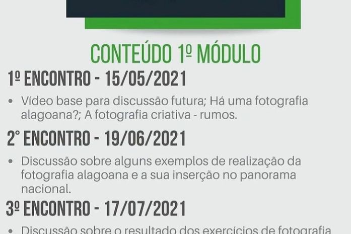 O primeiro encontro, que ocorrerá no sábado (15), discutirá a partir de um texto e um vídeo de Francisco Oiticica, se há a fotografia alagoana e quais os rumos da Fotografia Criativa; No segundo encontro, que ocorrerá dia 19/06, serão discutidos alguns exemplos de realização da fotografia alagoana e sua inserção no panorama nacional; No último encontro, de finalização do módulo, serão apresentados as fotografias e os resultados das discussões do grupo. Para participar, é necessário se inscrever pelo link que está na biografia do Instagram da Casa Alagoana da Photografia (@caphmaceio), mandando um email para caphmaceio2021@gmail, ou pelo Whatsapp (82) 99111-1192. Será cobrada uma taxa de inscrição de R$ 50 pelo módulo com três aulas, e R$ 20 por apenas uma aula do módulo. Os pagamentos podem ser realizados por Pix ou transferência bancária. Ao finalizar a inscrição, o participante será adicionado a um grupo do Facebook, onde terá acesso ao material necessário para os estudos, e em um grupo do Whatsapp, onde receberá os avisos.