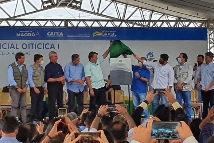 Sem máscara e ao lado de aliados políticos, o presidente Jair Bolsonaro entregou as primeiras chaves dos apartamentos do Conjunto Habitacional Oiticica I, na manhã desta quinta-feira (13), no bairro do Benedito Bentes, em Maceió, a famílias sorteadas.