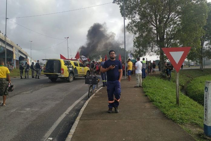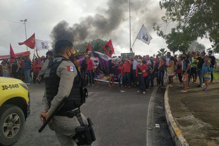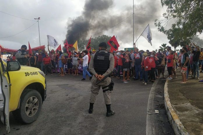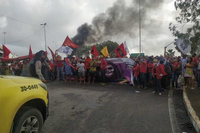 Após mais duas horas de protesto, policiais militares conseguiram dispersar os manifestantes que bloqueavam o acesso ao Aeroporto Zumbi dos Palmares, na manha desta quinta-feira (13), contra a chegada do presidente Jair Bolsonaro em Alagoas.
