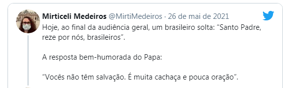 O primeiro encontro do padre João Paulo, de Campina Grande (PB), com o papa Francisco acabou de forma descontraída nesta quarta-feira (26). O sacerdote brasileiro, que está no Vaticano estudando Teologia, fez um pedido especial para o pontífice. "Santo Padre, reze por nós, brasileiros". A resposta foi, no mínimo, inusitada. "Vocês não têm salvação. É muita cachaça e pouca oração", disse o papa, em tom de brincadeira.
