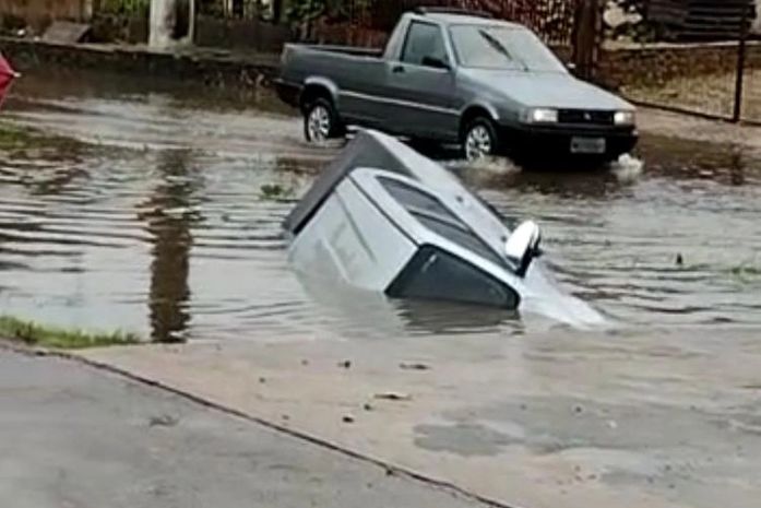 Em vídeo divulgado, o veículo de cor branca e modelo Hilux aparece afundando em meio às águas que alagam diversas ruas do bairro.