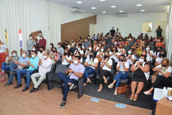 O prefeito George Clemente, a secretária municipal de Assistência Social, Jacqueline Vieira, a secretária adjunta, Raimunda Clemente, a Superintendente da Seades e Gestora Estadual do CRIA, Danyele Gazzaneo, o secretário municipal de Articulação Política, Jó Clemente, e o presidente da Câmara dos Vereadores, Diney Torres, formaram a mesa de honra.