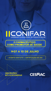 O curso de Farmácia do Cesmac realiza, de 07 a 10 de julho, o II Congresso Internacional de Farmácia On-Line (CONIFAR). O evento, que é presidido pelo Prof. Dr. Thiago José Matos Rocha, tem caráter técnico-cientifico, sendo destinado a acadêmicos e profissionais da área de Farmácia. O evento envolve áreas de Farmacognosia, Fitoterapia, Farmacobotânica, Química dos Produtos Naturais, Química Farmacêutica, Análises Clínico-Laboratoriais, Farmacologia Clínica, Farmácia Hospitalar e Clínica, além de Farmácia Industrial.