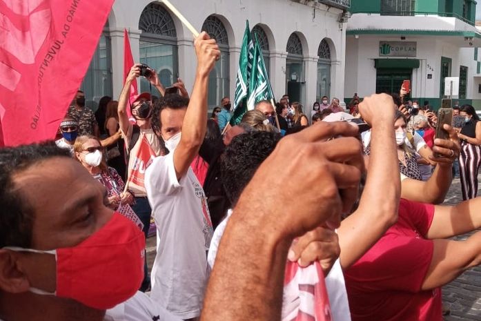 Manifestantes realizaram um protesto, nesta terça-feira (29), contra a concessão do título de cidadão honorário de Maceió ao presidente Jair Bolsonaro, em frente à porta da Câmara Municipal da capital, localizada no bairro Jaraguá.