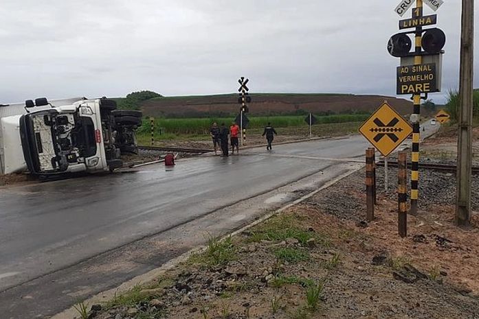 Um caminhão tombou após colidir com o Veículo Leve Sobre Trilhos (VLT) em uma área rural, próxima à sina Utinga Leão, em Rio Largo, na manhã desta quinta-feira (1º).