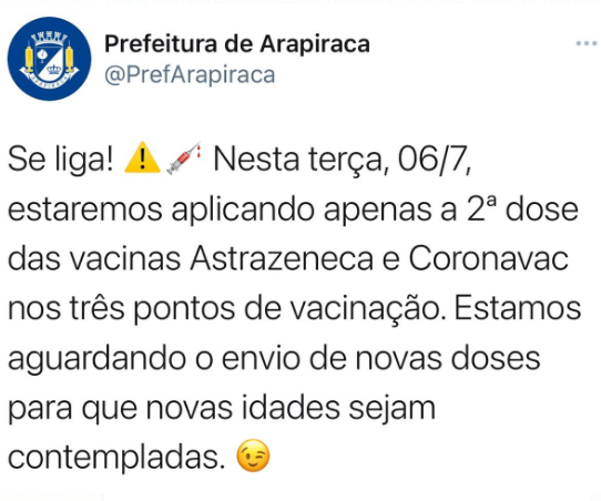A Prefeitura de Arapiraca anunciou, na noite desta segunda-feira (5), que estará aplicando apenas a segunda dose das vacinas AstraZeneca e Coronavac nesta terça-feira (5).