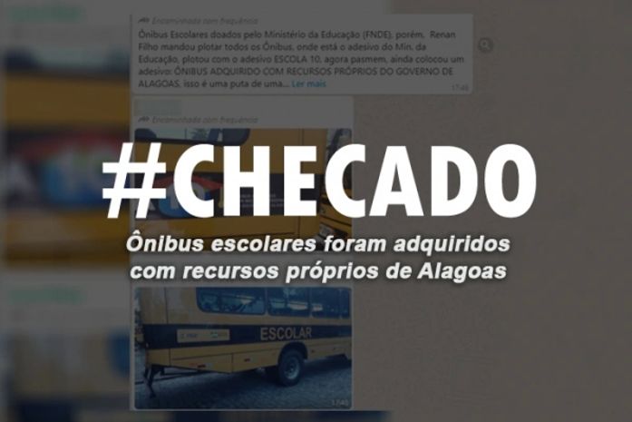 A mensagem enganosa utiliza imagens de ônibus escolares com o intuito de dizer que o Governo de Alagoas teria se aproveitado de recursos federais para se promover e ocultar investimentos do Governo Federal: “Ônibus escolares doados pelo Ministério da Educação (FNDE), porém Renan Filho mandou plotar todos os ônibus, onde está o adesivo do Min. da Educação, plotou com o adesivo Escola 10, agora pasmem, ainda colocou um adesivo: ônibus adquirido com recursos próprios do Governo de Alagoas, querendo induzir as pessoas com a aquisição de araque. Vamos divulgar pra todos os grupos, até chegar nas autoridades competentes (sic)”, acusa o texto.