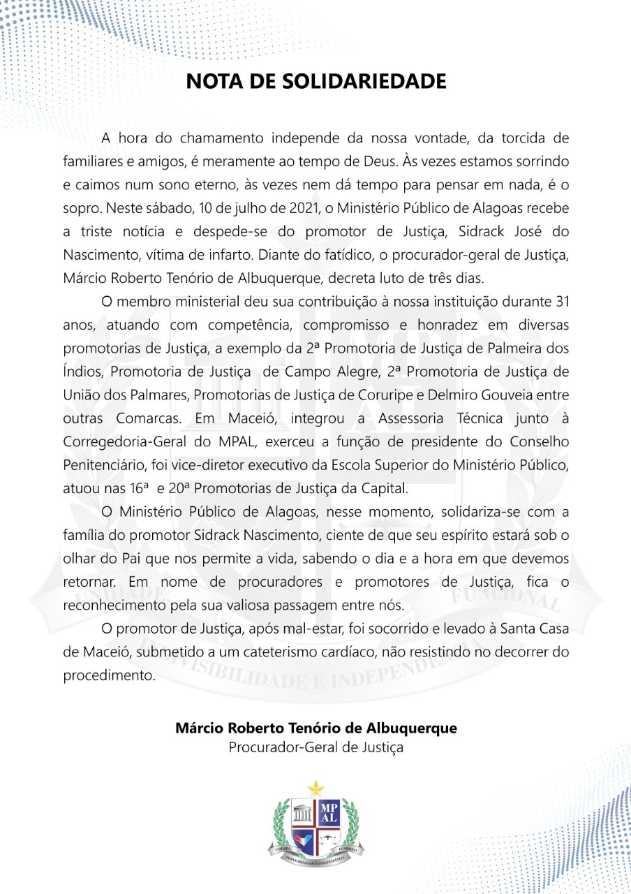 Em nota a entidade lamentou o falecimento do promotor vítima de infarto. “A AMPAL manifesta seus sentimentos à família e amigos, e rogamos ao bom Deus que conforte a todos nesse momento com fé e resignação”, colocou a associação.