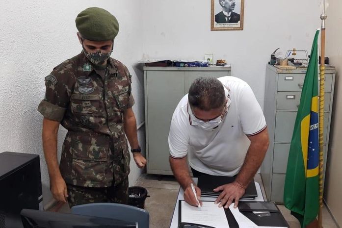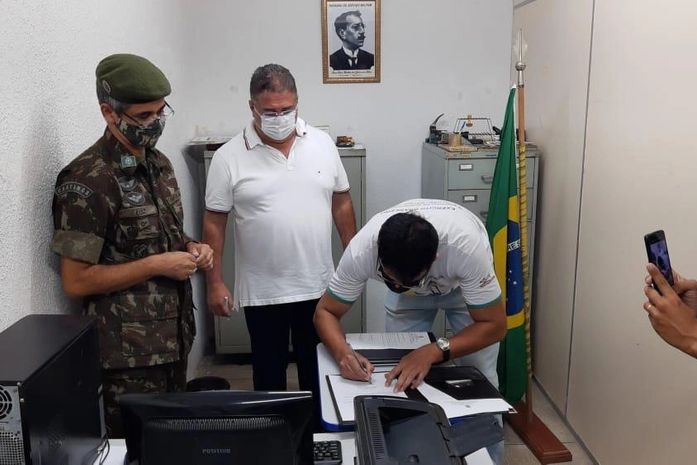 O prefeito assinou o termo de posse e fez o juramento à Bandeira, com a participação do Tenente do Exército, Luiz Nascimento e do secretário da Junta Militar de São Miguel dos Campos, Alex.