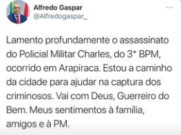 “Lamento profundamente o assassinato o assassinato do Policial Militar, Charles, do 3º BPM, ocorrido em Arapiraca. Estou a caminho da cidade para ajudar na captura dos criminosos. Vai com Deus. Guerreiro do Bem. Meus sentimentos à família, amigos e à PM”, postou o secretário nas redes sociais.