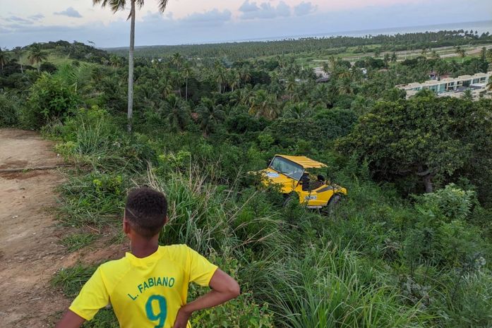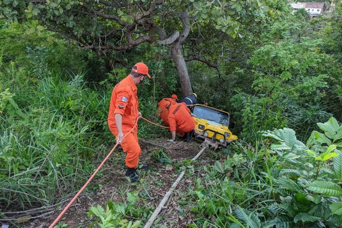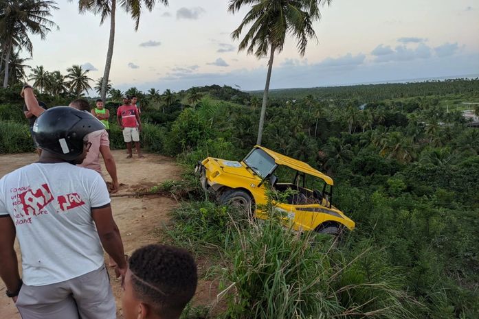 Imagens mostram o Buggy em uma ribanceira, de cerca de 15m de altura. De acordo com o CBM/AL, o veículo ficou apoiado em uma árvore que impediu que o mesmo caísse por mais de 30 metros.