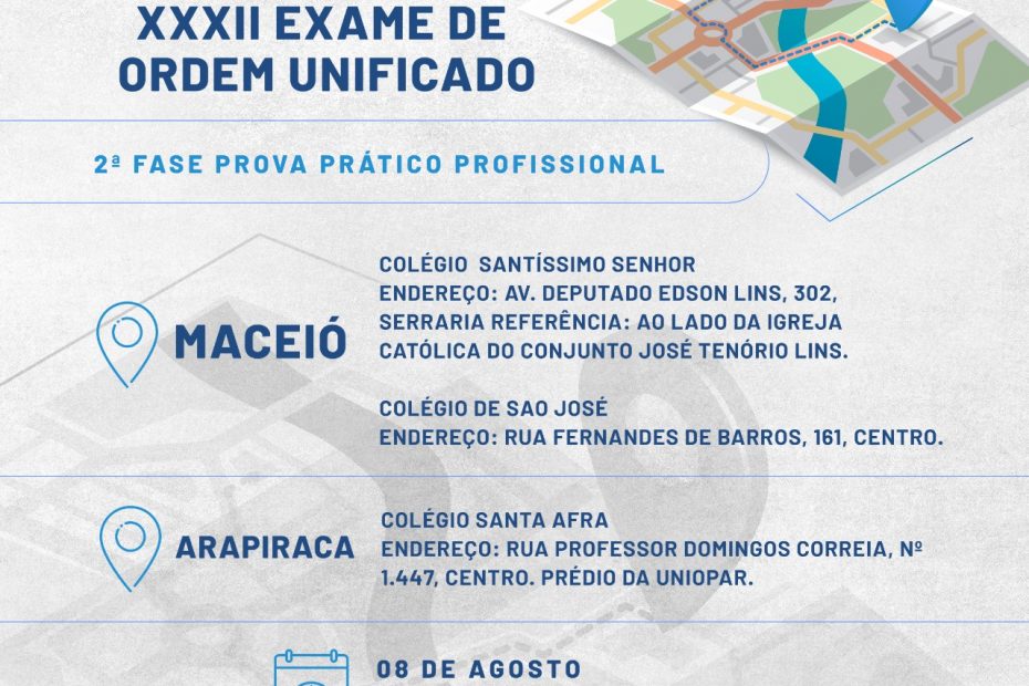 A OAB Nacional, por meio da Coordenação Nacional do Exame de Ordem Unificado, divulgou os locais de aplicação de prova para a 2ª Fase da Prova Prática Profissional do XXXII Exame de Ordem Unificado. Em Maceió, serão 612 participantes, sendo 348 no Colégio Santíssimo Senhor e 264 no Colégio de São José. Já em Arapiraca, a prova será realizada por 172 participantes no Colégio Santa Afra. A abertura dos portões será às 11h.